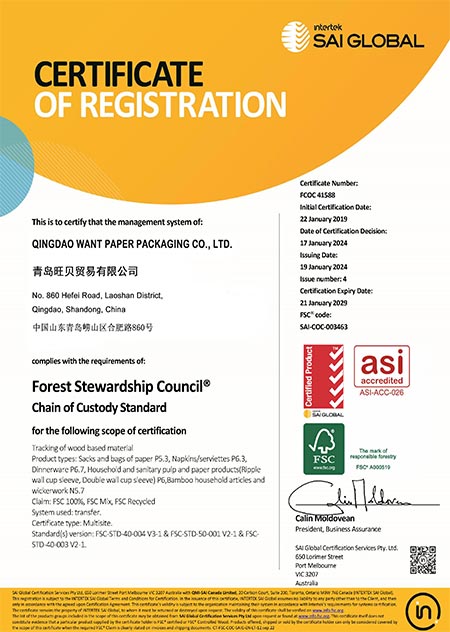 Gure enpresaren produktu nagusiak nazioartekoak gainditu dituzte Ziurtagiriak BRC, BPI, FSC, DIN, Pha Marine Ziurtagiri biodegradagarria, ABA Hasiera konpostagarria eta SEDEX Amaiera handiko ostalaritzaren ziurtagiria eta probak egiteko baldintzak Hornitzaileentzako enpresak.
